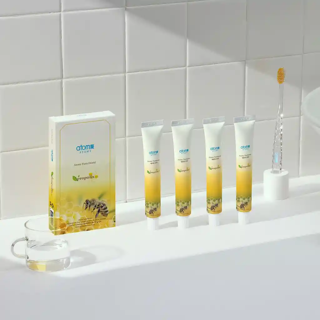 La pasta dental Atomy es una fórmula avanzada que combina ingredientes naturales como propóleos y extracto de té verde con componentes científicos para una protección dental integral. Su acción sinérgica no solo limpia, sino que también previene caries, elimina el mal aliento y fortalece la salud bucal.Ingredientes y Beneficios:Propóleos: Resina natural recolectada por abejas, con propiedades antibacterianas y antiinflamatorias que protegen las encías y reducen la placa.Extracto de té verde: Rico en antioxidantes, neutraliza el mal aliento y combate las bacterias causantes de caries.Complejo fluorado (Monofluorofosfato + Fluoruro de sodio): Fortalece el esmalte dental y duplica la protección contra caries.Xilitol: Endulzante natural que inhibe el crecimiento de bacterias y previene la formación de placa.Aceite de naranja y fragancia cítrica: Proporciona una sensación de frescura prolongada y aliento agradable.Beneficios Principales:Elimina placa y sarro: Previene la acumulación de bacterias y la formación de sarro.Protección avanzada contra caries: Gracias a la acción combinada de flúor y xilitol, reforzando el esmalte dental.Combate el mal aliento: El extracto de té verde y la fragancia cítrica neutralizan los olores bucales.Antibacteriano natural: El propóleo y triclosán (si aplica) ayudan a mantener encías sanas y reducir inflamaciones.Frescura intensa: Deja una sensación limpia y refrescante después de cada cepillado.NO TIENE GARANTIA.