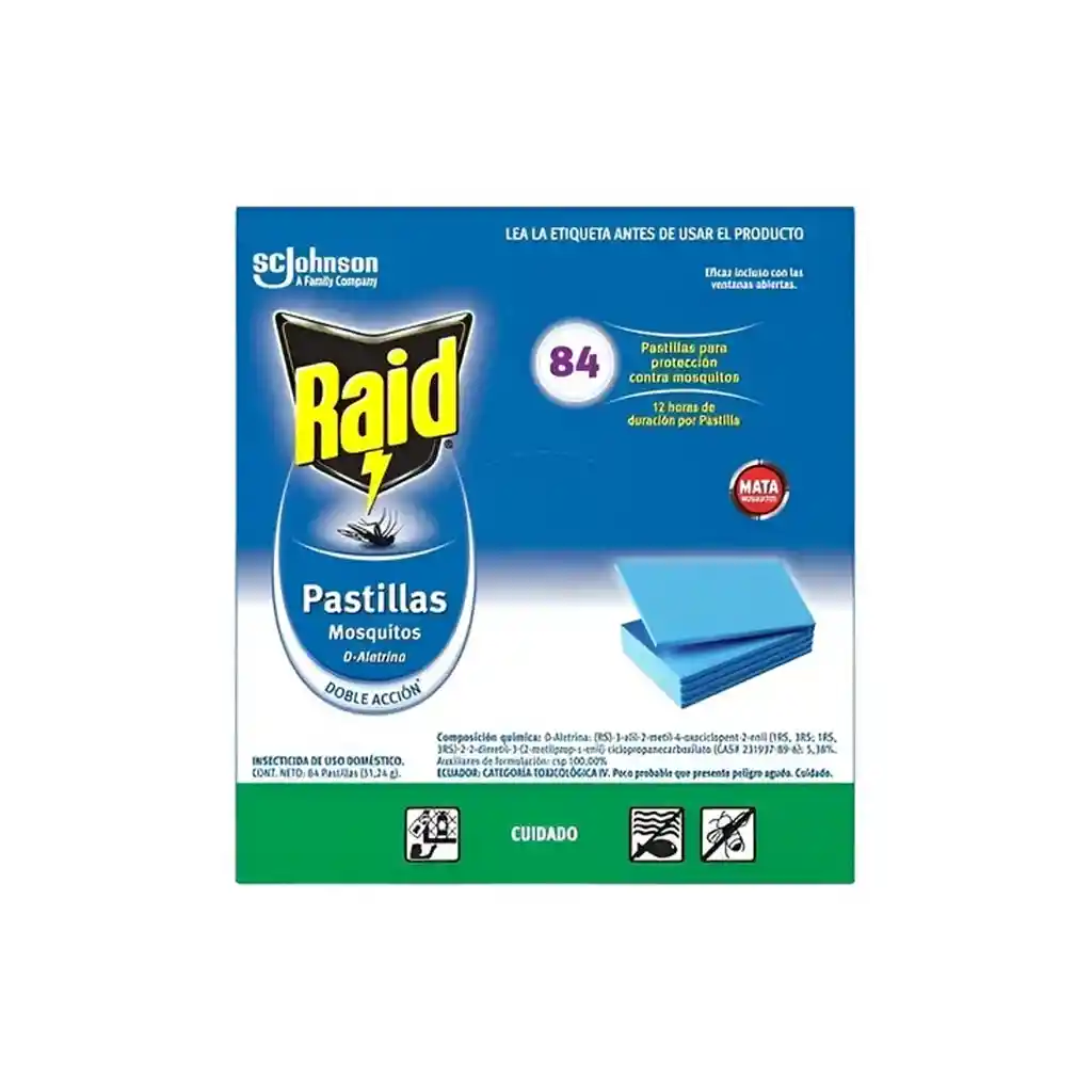 Proteja su hogar de los mosquitos con las Pastillas Raid Repuestos, presentadas en una caja de 84 unidades. Cada pastilla está diseñada para utilizarse en electrodomésticos eléctricos, liberando un insecticida que ayuda a eliminar y repeler mosquitos en espacios interiores. Cada pastilla ofrece hasta 12 horas de protección continua . Ideal para habitaciones, salas y otros espacios del hogar donde se requiera protección contra insectos voladores. Su formato en pastillas es de fácil reemplazo, permitiendo mantener una protección constante durante toda la temporada de mosquitos. ______________________________________________________ ________ Somos QUICK MART Comercializadora y Distribuidora de productos Nacionales e Importados, calidad garantizada 100% original. Dentro de nuestro portafolio de productos podrás encontrar licores (debidamente estampillados), alimentos, dulces, productos de aseo y mucho más de acuerdo a tu necesidad. Estamos ubicados en la ciudad de Bogotá, por medio de MERCADO ENVÍOS hacemos despachos a nivel nacional, si compras antes de la 14pm por MERCADO FLEX entregamos el mismo día (aplica solo para Bogotá), en horario extendido hasta las 10 p.m. Invitamos a nuestros clientes a visitar nuestra tienda virtual en MercadoShop con las mismas garantías de Mercado Libre, allí podrás conocer todo nuestro catálogo y encontrar promociones que solo aplican en nuestra tienda virtual. Las imágenes utilizadas son de referencia y por lo tanto la presentación del producto puede variar en el momento del despacho, el producto es el mismo ya el empaque depende de cada proveedor. ______________________________________________________________
