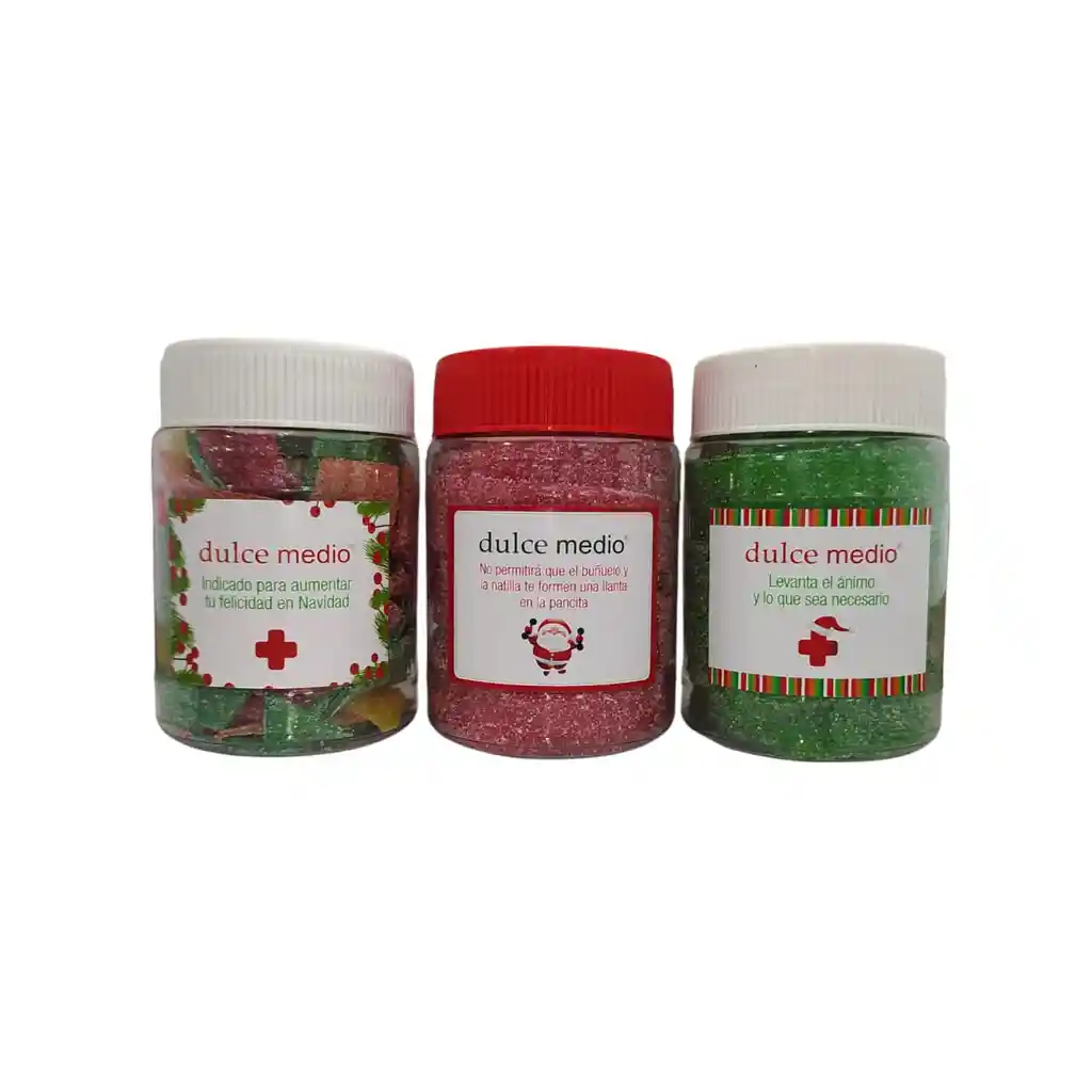 Dosis de felicidad de *210 gr. Viene con 1 fórmula a elección y una composición genérica FORMULAS: 1. Para un gran beso navideño 2. No permitirá que el buñuelo y la natilla te formen una llanta en la pancita. 3. Alivia el guayabo después de cada fiesta. 4. Es Navidad ¡Quiereme más! 5. Contra la arruguita de un nuevo año. 6. Para cantar. bailar y celebrar en esta navidad.