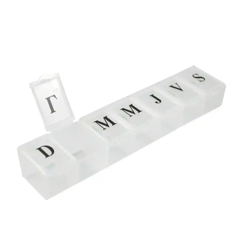 Pastillero Semanal. De lunes a domingo. Elaborado en plástico duradero. Tapas abre y cierra fácilmente. Excelente calidad y durabilidad.