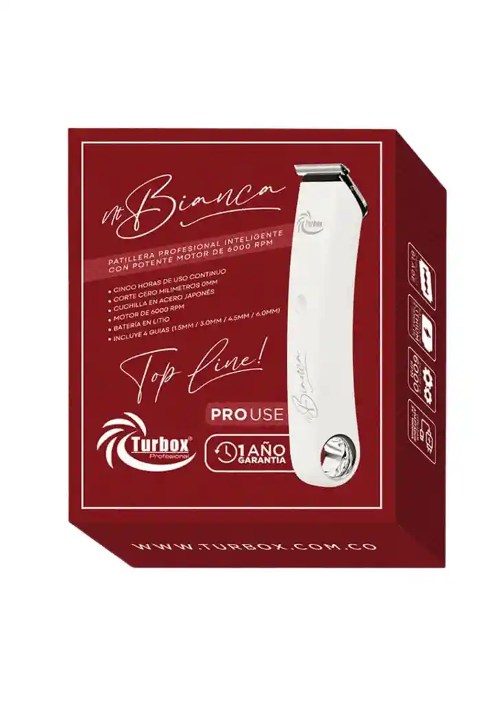 La Patillera Profesional NT-Bianca de Turbox es una herramienta de alta precisión diseñada para barbería detallada y acabados definidos. Se destaca por su diseño elegante y ergonómico, orientado a trabajos que requieren un control absoluto en áreas pequeñas.Especificaciones TécnicasCuchilla en T (T-Blade): Fabricada en acero inoxidable de alta calidad, diseñada para realizar cortes extremadamente cercanos a la piel (cercanos al "cero") sin causar irritación.Motor Rotativo de Alta Potencia: Ofrece una velocidad constante que permite cortes limpios en una sola pasada, incluso en cabellos gruesos o barbas densas. Batería de Litio: Proporciona una autonomía de uso inalámbrico prolongada (generalmente entre 90 y 120 minutos), con un tiempo de carga rápida. Indicador LED: Pantalla o luz integrada que muestra el estado de la batería para evitar que la herramienta se apague en medio de un servicio. Usos Principales en Barbería Delineado de Contornos: Ideal para marcar la línea del cuello, la frente y detrás de las orejas con nitidez. Diseño y "Hair Tattoo": Gracias a su cabezal expuesto y delgado, permite realizar dibujos y líneas creativas en el cuero cabelludo con facilidad .Limpieza de Barba: Perfecta para definir los bordes de la mejilla y el bigote, logrando simetría profesional. Terminación de Fades: Se utiliza para pulir la base de los degradados antes de pasar la shaver o la navaja. Ventajas de la NT-Bianca Visibilidad 360°: Muchos modelos de esta línea cuentan con un diseño de cuchilla abierta, lo que permite al barbero ver exactamente dónde está cortando sin que la carcasa bloquee la vista. Ligereza: Su peso balanceado reduce la fatiga en la muñeca durante jornadas largas de trabajo. Funcionamiento Silencioso: A pesar de su potencia, el motor está diseñado para generar una vibración baja y poco ruido, mejorando la experiencia del cliente. Mantenimiento Sugerido Para conservar el filo de la NT-Bianca y la salud del motor: Limpieza: Usar el cepillo después de cada uso para eliminar microcabellos .Lubricación: Aplicar una gota de aceite en los extremos y el centro de la cuchilla cada 2 o 3 servicios. Cabezales: Si los cabezales son desmontables, asegúrate de secarlos bien si decides usar alguna solución líquida de limpieza. Running Shopping, Somos especialistas en Belleza ; productos 100% Originales , garantizados y entregas rapidas !