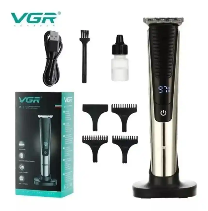VGR V-178 5W USB portátil Clipper con pantalla LED con base Maquina patillera/Barbera de uso profesional(Barberia o casa), acero inoxidable, De alta dureza y fácil de limpiar. Cuenta con un diseño de esquina que se ajusta perfectamente a la curva de la cabeza sin dañar el cuero cabelludo, Fácil de manejar, Cuenta con una pantalla LCD en la parte inferior que muestra el estado de la batería, con accesorios ideales para cualquier ocasión, También trae un cable con el que puedes conectar la maquina para ir a todos lados con ella sin que se te descargue. Capacidad de la batería: 1200mAh Duración de la batería: 120-140 Minutos Tiempo de carga: 2-3 Horas Potencia: 5W
