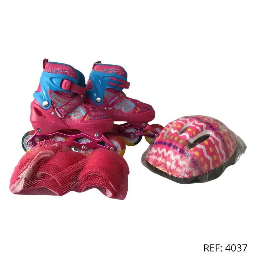 Set de patines con casco y protecciones. Colores vibrantes. Tallas: 28, 33, 34, 36, 37, 39. ¡Diversión segura!
