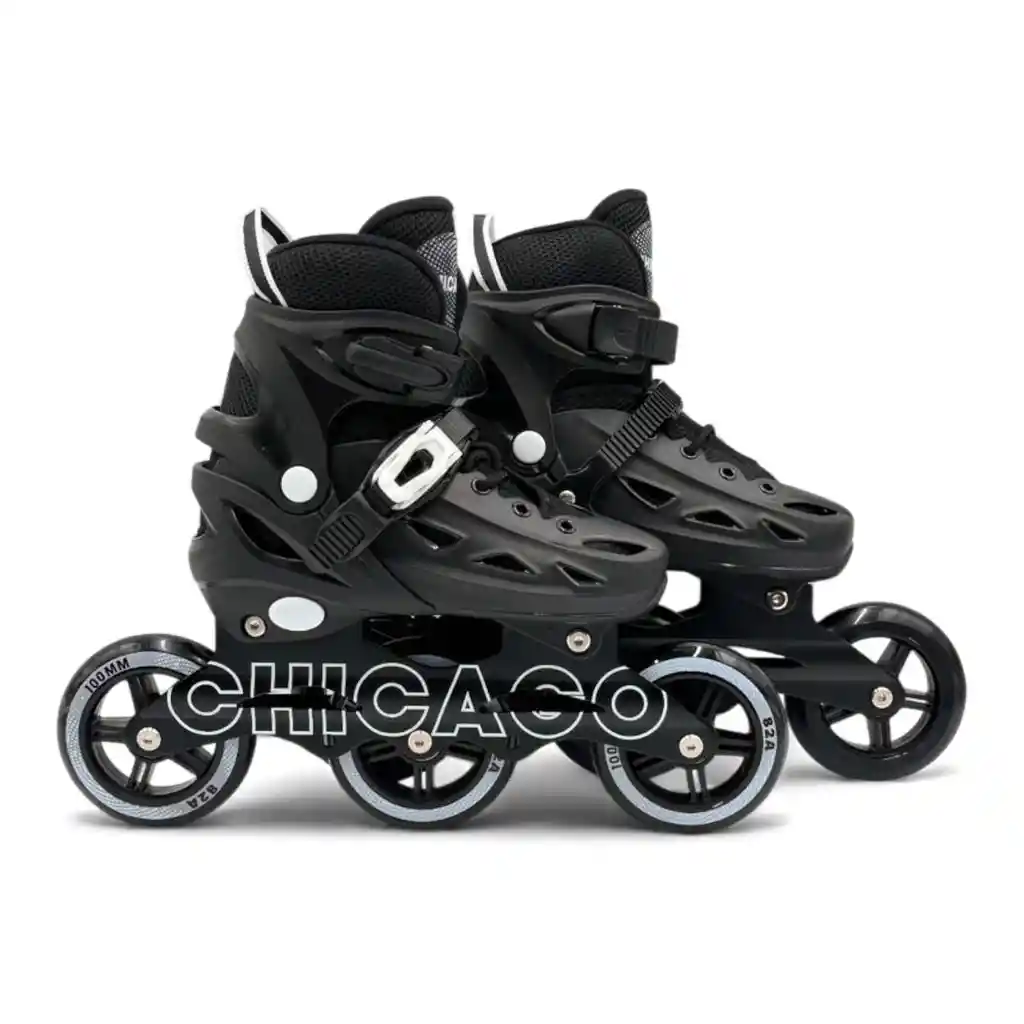 ADULTOS : Si eres Mujer con pie delgado te sugerimos seleccionar 2 tallas más de la que eres en calzado, si tienes pie ancho te sugerimos seleccionar 3 tallas más de la que eres en calzado. Si eres Hombre te sugerimos seleccionar 3 tallas más de la que eres en calzado. NIÑOS FAVOR TENER EN CUENTA ! SUGERIMOS COMPRAR LOS PATINES 1 Ó 2 O HASTA 3 TALLAS MÁS DE LO QUE NORMALMENTE CALZA EL INFANTE, YA QUE SE NECESITA ESPACIO PARA SU DESPLAZAMIENTO. (28-33) Apta para calzado 26 a 32 (34-37) Apta para calzado 31 a 35 • Chasis en aluminio de alta resistencia CARACTERÍSTICAS Combo de patines marca Chicago, Profesional) resistentes, suaves y duraderos, tallas disponibles S: 28-29-31-32-33 TALLA M : 34,35,36,38 Aspecto super juvenil.
