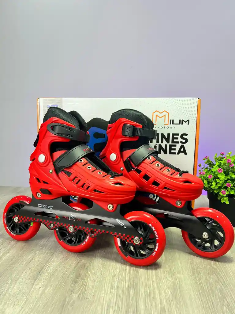 Patines semiprofesionales marca Mundial de Patines, con las siguientes características: * Llantas en goma dureza 82ª, * Bota que se ajusta, cordón velcro y cierre de seguridad. * Chasis elaborado en Aluminio, más resistente y seguro. * Rodamientos ABEC 9 * Aprobados para escuela de patinajes * Patines ajustables para crecimiento del niño