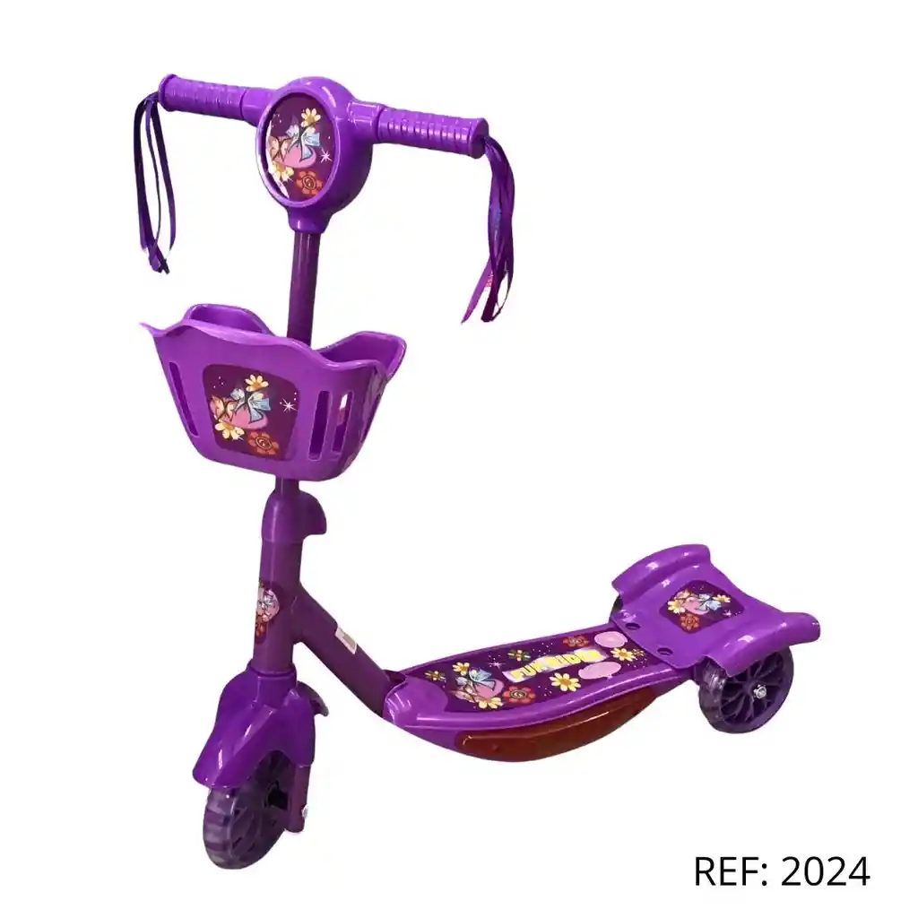 Scooter infantil de tres ruedas, resistente, con canasta delantera y manubrio con cintas decorativas. Ideal para niños pequeños.