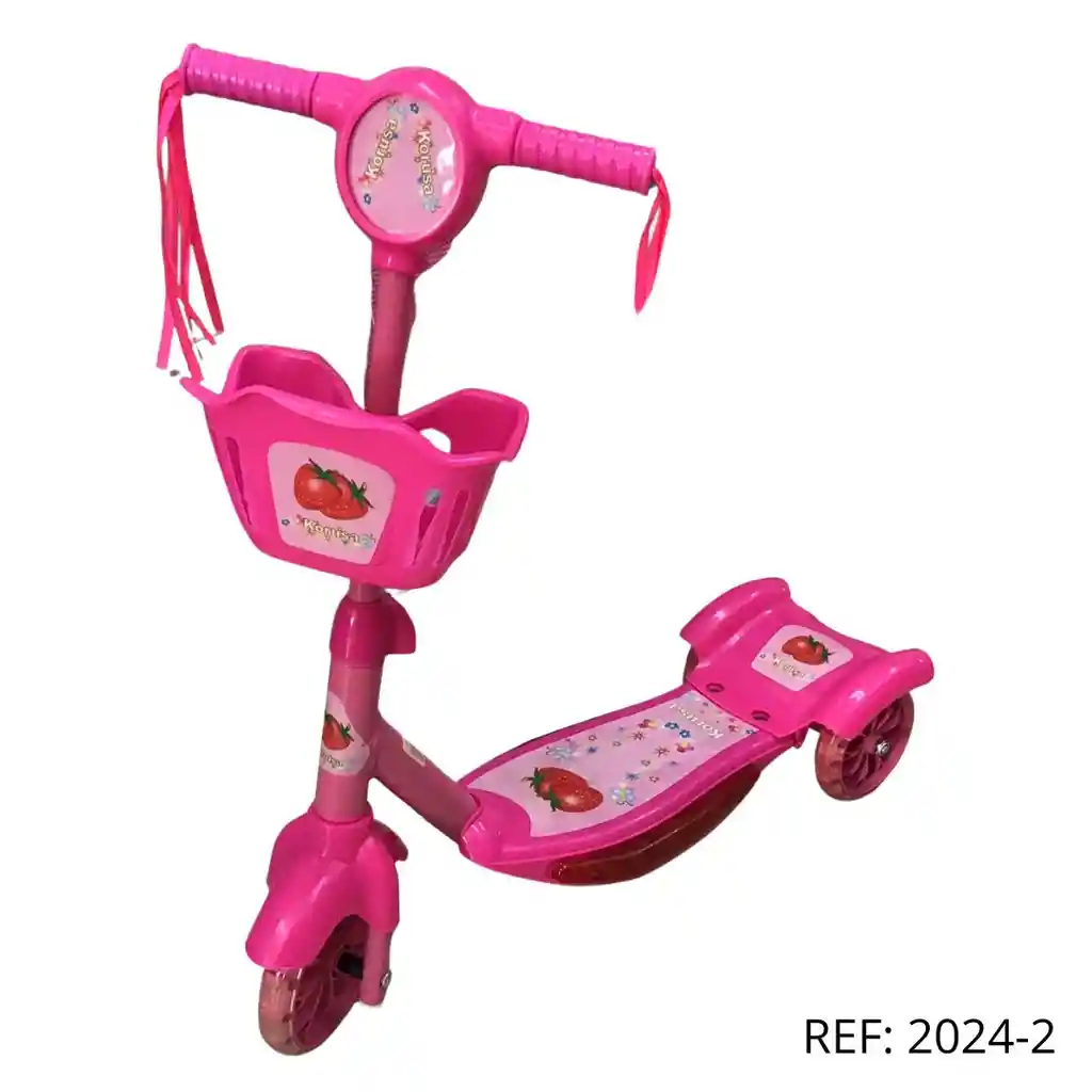 Scooter infantil de tres ruedas, resistente, con canasta delantera y manubrio con cintas decorativas. Ideal para niños pequeños.