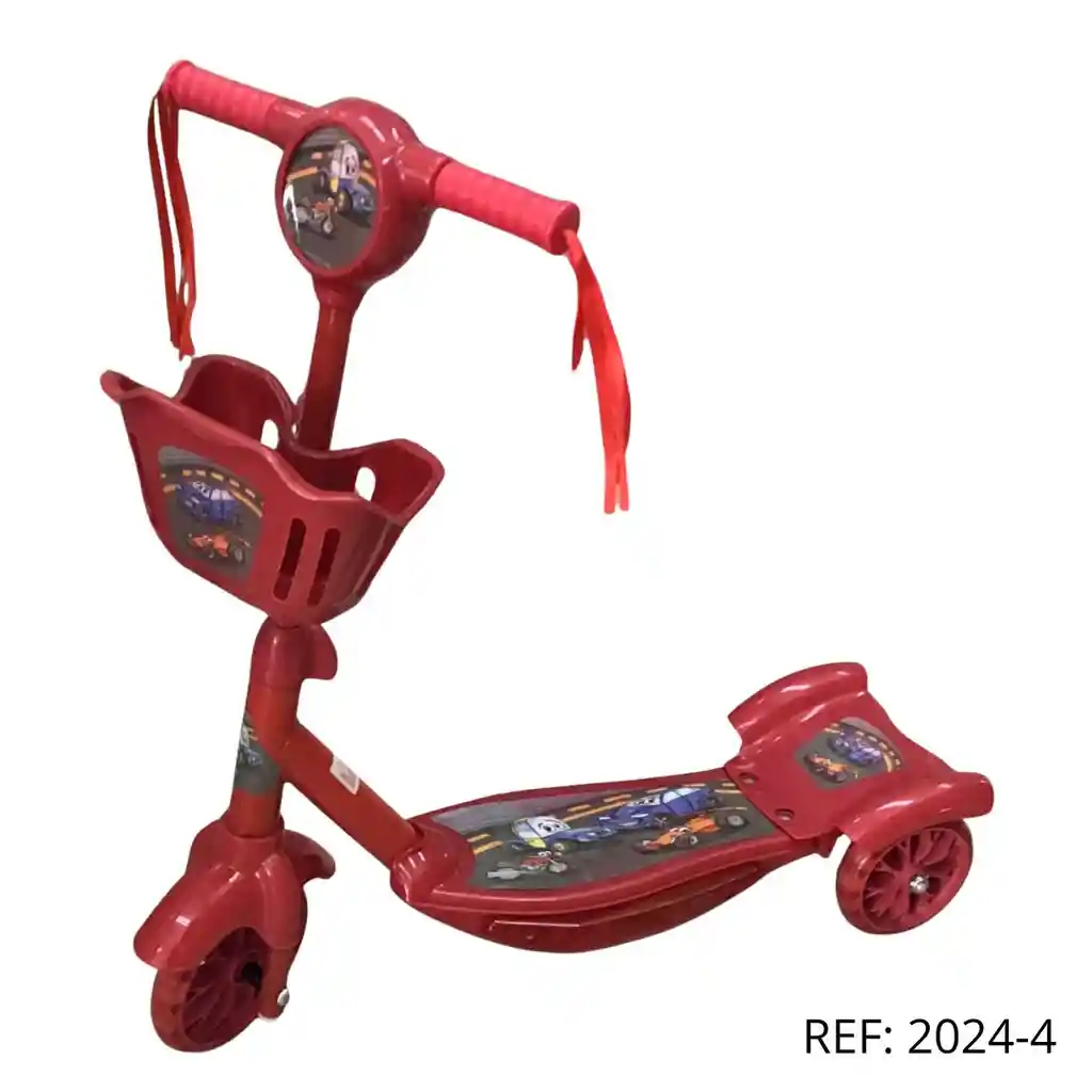 Scooter infantil de tres ruedas, resistente, con canasta delantera y manubrio con cintas decorativas. Ideal para niños pequeños.