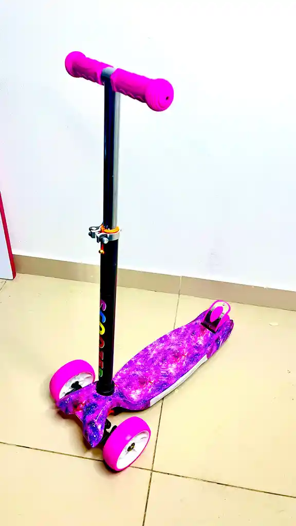 🛴 -Excelente calidad reforzada en aluminio ideal para niños y niñas de 3 a 10 años -Ruedas anchas de goma con luces LED - Chasis luminoso con música - Altura ajustable 3 niveles - Altura mínima 60 cm -Altura máxima 83 cms -Dirección asistida - Soporta 80 kg -Barra en aluminio Colores disponibles 💜❤💙🩷