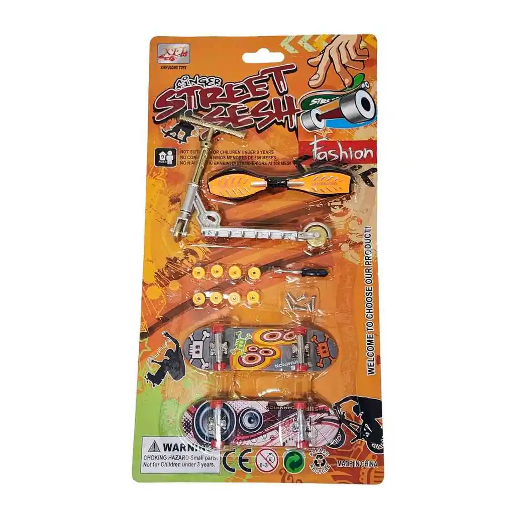 ¡Domina el asfalto con la punta de tus dedos y conviértete en una leyenda del skatepark con el increíble set Street Tech! Este completo paquete de deportes extremos en miniatura lo tiene todo para la acción: dos patinetas de dedos con diseños urbanos, un ágil scooter y un waveboard para que varíes tus acrobacias. Siente la experiencia de un verdadero profesional con el kit de herramientas y las llantas de repuesto incluidas, que te permitirán ajustar, reparar y personalizar tu equipo para cada sesión. Es el set definitivo para practicar tu destreza, inventar trucos imposibles y llevar toda la emoción del estilo urbano a cualquier lugar. Ficha Técnica: Material : Plástico ABS no tóxico Edad Recomendada : + 3 Años en adelante. Dimensiones del empaque: 28 cm x 15 cm x 2 cm Dimensiones : 10 cm x 3 cm Referencia: 012-13 Certificado de conformidad: E5-0359-2021 ** _Para defectos de fábrica o retractos: \_Por favor revise el producto apenas lo reciba y antes de usarlo. No aplican ley de retracto o defectos de fábrica luego de usar el producto. Se manejan máximo 5 días para reportar defectos de fábrica (por ejemplo, producto funciona mal, piezas faltantes, rotas, etc). Para hacer efectiva la devolución el producto debe devolverse con el empaque original, el cual debe estar en buen estado, incluir todos los documentos y las partes completas y sin daños.