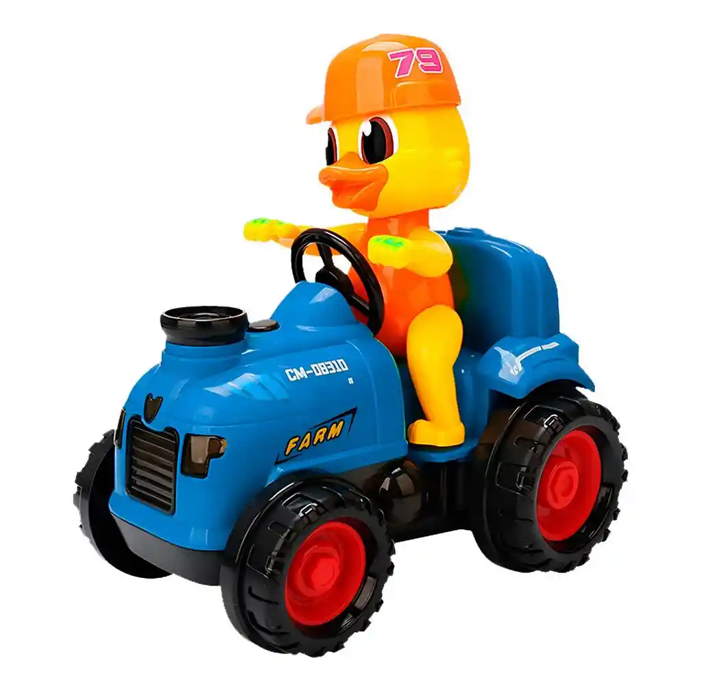 ¡La diversión arranca en la granja con el tractor musical del Patito Granjero! Este simpático patito se pone al volante para una aventura llena de estímulos, conduciendo su tractor por toda la habitación mientras suenan alegres melodías. La magia realmente comienza cuando se apagan las luces, ya que su vehículo no solo ilumina el camino con sus potentes faros, sino que también proyecta un deslumbrante y colorido espectáculo de luces giratorias en el suelo, creando un ambiente de fiesta. Es el juguete perfecto para capturar la imaginación de los más pequeños, fomentando el movimiento y la estimulación sensorial con una inolvidable combinación de luces, música y diversión sobre ruedas. /// El juguete incluye baterías /// Ficha Técnica: Dimensiones del juguete : 18 cm x 13 cm x 11 cm Material: Plástico ABS no toxico Edad recomendada + 3 Años Fuente de energía del juguete: Batería AA Referencia: HG788-4 Certificado de conformidad: SL-CS-210044 ** _Para defectos de fábrica o retractos: \_Por favor revise el producto apenas lo reciba y antes de usarlo. No aplican ley de retracto o defectos de fábrica luego de usar el producto. Se manejan máximo 5 días para reportar defectos de fábrica (por ejemplo, producto funciona mal, piezas faltantes, rotas, etc). Para hacer efectiva la devolución el producto debe devolverse con el empaque original, el cual debe estar en buen estado, incluir todos los documentos y las partes completas y sin daños.