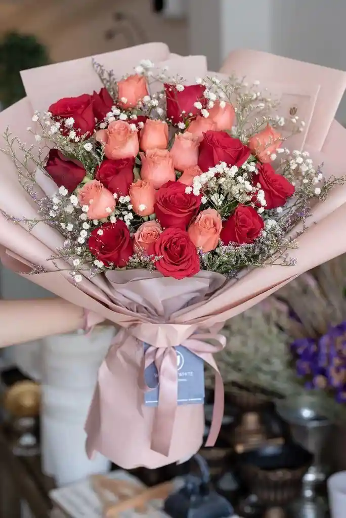 Hermoso ramillete tamaño grande realizado con lirios, rosas, claveles y flores de complento en tonos cálidos. Envuelto en papel perlado importado, una opción muy elegante.