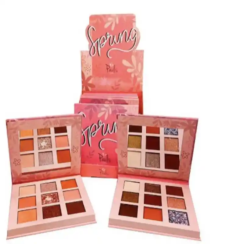 La paleta de sombras de maquillaje Spring de Pauli’s Glow, tiene 9 tonos de sombras entre tonos neutros con tendencia cálida, y acabados mate y satinados.