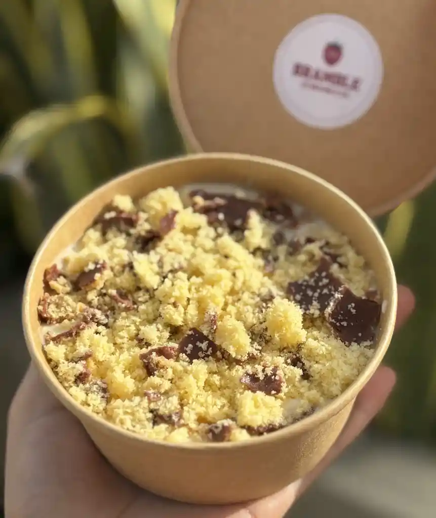 El Pavé de Chocoramo Bramble es un postre artesanal elaborado con capas de suave crema, trozos de Chocoramo y una cubierta crocante que combina texturas irresistibles. Su presentación en bowl es perfecta para compartir o disfrutar individualmente.