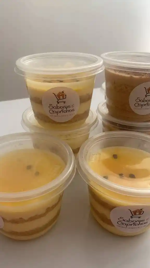 Postre cremoso artesanal con capas de galleta semidulce con sabor a maracuyá.