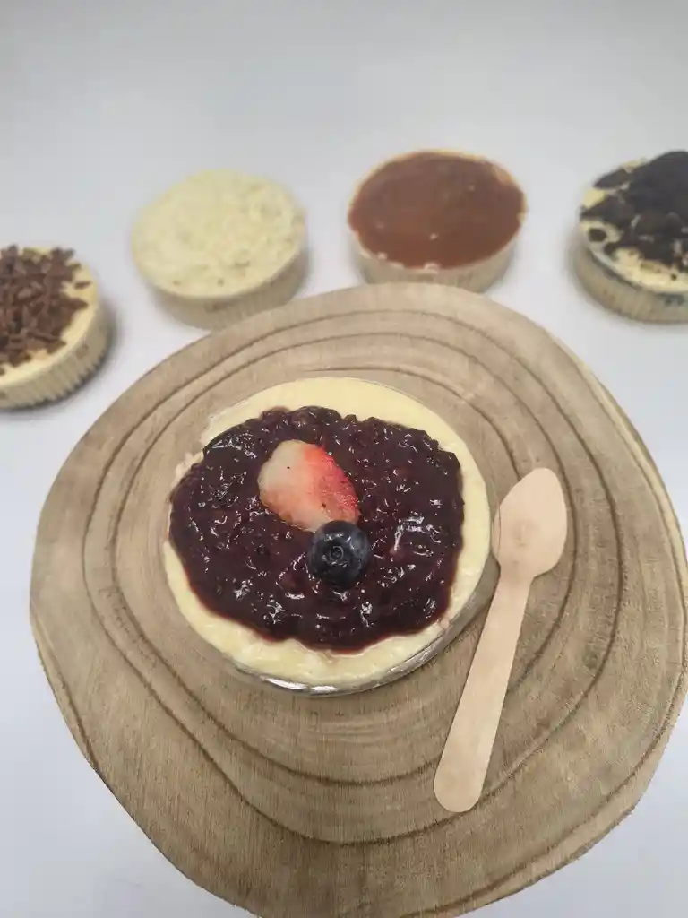 Crema suave 4 leches Galletas ducales Reducción de frutos rojos Media fresa y arándano