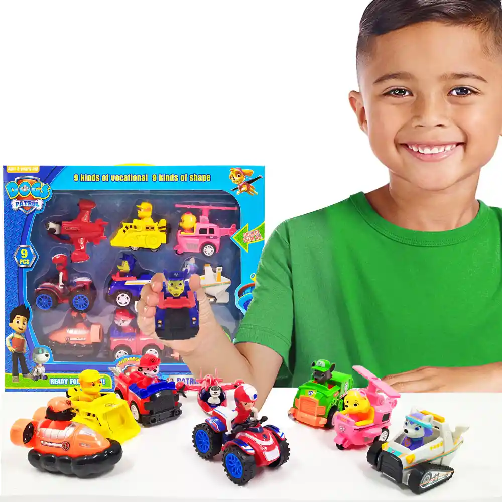 COLECCIÓN PATRULLA CANINA X9 Acompaña a tus grandes amigos de la patrulla canina a grandes aventuras. Desarrolla la imaginación de tus hijos en compañía de sus héroes de 4 patas. Con este increíble y completo set de todos los personajes caninos de la serie animada tu hijo se divertirá en grande. Son 9 personajes cada uno con su respectivo vehículo de impulso. Tamaño Empaque: 28 cm de Alto x 31 cm de Largo x 5 cm de Ancho. Material: Plástico Los juguetes siempre han desempeñado un papel importante en la vida de los niños, siempre considerando los gustos y deseos de los más pequeños de la casa y no tan pequeños, procurando dar la mejor de las sorpresas y ganarse esa sonrisa incomparable que los llena de felicidad. Juguetes, cuentos, y cualquier producto orientado a la satisfacción y desarrollo de los niños. Diversión, entretenimiento y aprendizaje.