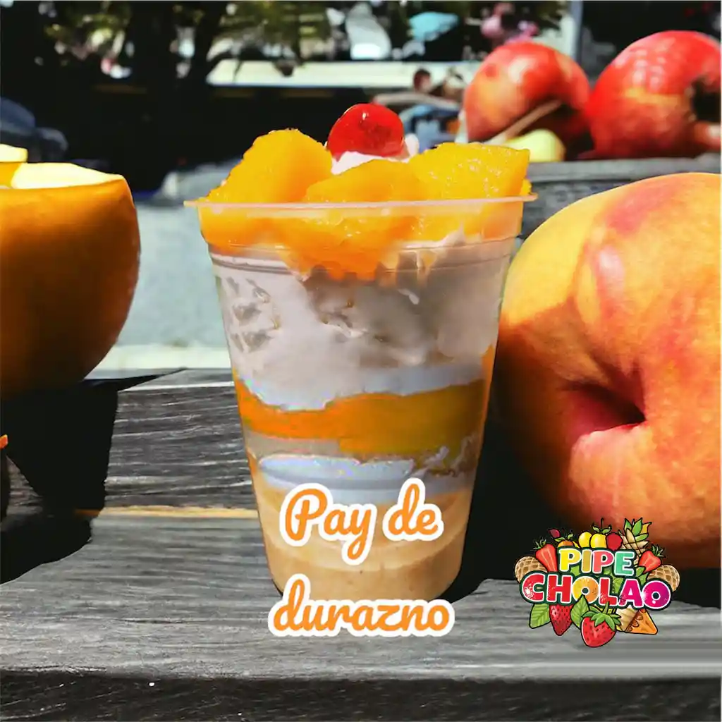 Deliciosos trozos de durazno con queso combinados con nuestra crema de la casa, acompañada de azucar pulverizada y unas finas cerezas