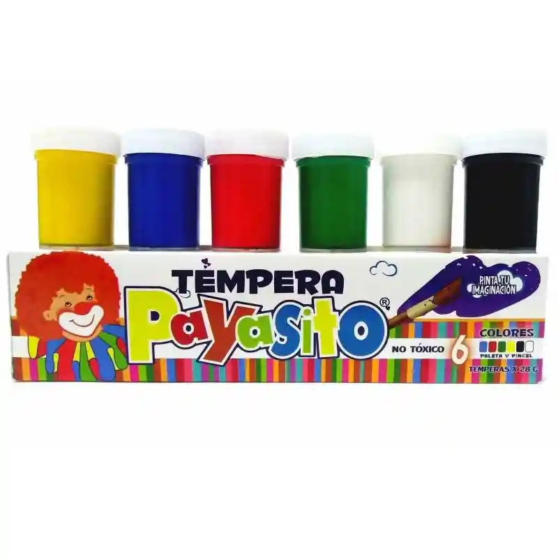 Tempera apta para uso escolar y manualidades. En colores amarillo, azul, rojo, verde, blanco y negro. Incluye témperas, Paleta y Pincel.