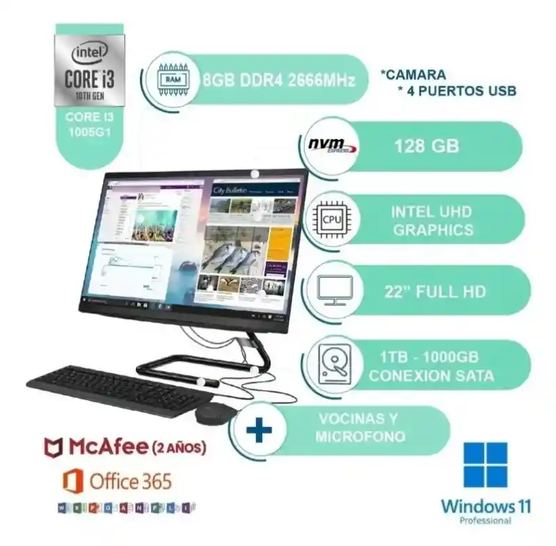 ====================================== Bienvenido/a nuestra tienda ELH COLOMBIA: "¡De la pantalla a tu hogar!" ====================================== - Contamos con el envío más rápido en Colombia! - Realiza tu compra sin perder tiempo, contamos con stock. - Nuestro despacho es automático, inmediato. 24 / 7 - Brindamos atención y soporte al cliente 24/7. - Garantía de 12 meses tras la compra de nuestro artículo. ====================================== Características Destacadas: ====================================== TODO EN UNO EDICION LIMITADA. IDEAL: PRODUCTIVIDAD / VELOCIDAD *Propiedades técnicas foto 2* -Procesador: Intel Core i3 1005G1 Decima generación! -Pantalla: 22 PULGADAS Full HD (1920×1080) IPS / Con bordes delgados -Memoria RAM: 8GB DDR4 2666MHz ALMACENAMIENTO: +NVME SSD 128GB ( 7 VECES MAS VELOCIDAD QUE UN SSD COMUN) DISCO DURO EXTRA INCLUIDO: 1TB - 1000GB CONEXION SATA -Sistema Operativo: WINDOWS 11 PRO LICENCIADO. - Cámara: Integrada en el Monitor - Vocinas y microfono integrados e incluidos en el equipo. -Puertos: 2 x USB 2.0 2 x USB 3.1 1 x Puerto de Red (RJ45) 1 x Audio/Micrófono 1 x HDMI - Conectividad: WiFi y Bluetooth -Color: NEGRO! *GARANTÍA 12 MESES LENOVO ORIGINAL Garantizamos nuestros artículos tanto técnica como legalmente. OJO ESTE ES EL MODELO 2022 CON GARANTIA EN TODO COLOMBIA, WINDOWS 11 PRO/SOLO AQUI! AL ADQUIRIR ESTE EQUIPO AQUI, LO RECIBIRÁ CON LO SIGUIENTE: *WINDOWS 11PRO LICENCIADO ORIGINAL! *SUITE OFFICE 365 LICENCIA ORIGINAL X 1 AÑO VIGENCIA SOBRE EQUIPO *LICENCIA ANTIVIRUS MCAFEE POR 2 AÑOS, PERMANENTE. *(WORD / EXCEL / POWER POINT / OUTLOOK PRO / SKYPE / ONE DRIVE ) *LICENCIA ANTIVIRUS MCAFEE POR 2 AÑOS, PERMANENTE. *SOPORTE Y ASISTENCIA EN LINEA X 1 AÑO - ELH COLOMBIA ===================================== ¿Por qué elegirnos? ===================================== - Obtienes una capa de software personalizada en Colombia. - Somos distribuidores, ofrecemos precios especiales por volumen de compra. - Emitimos factura de compra. - Usa tu medio de pago preferido de forma segura. - ¡Nuestra calidad de servicio durante y después de tu compra es PLATINO! ELH Colombia a un clic de ti.