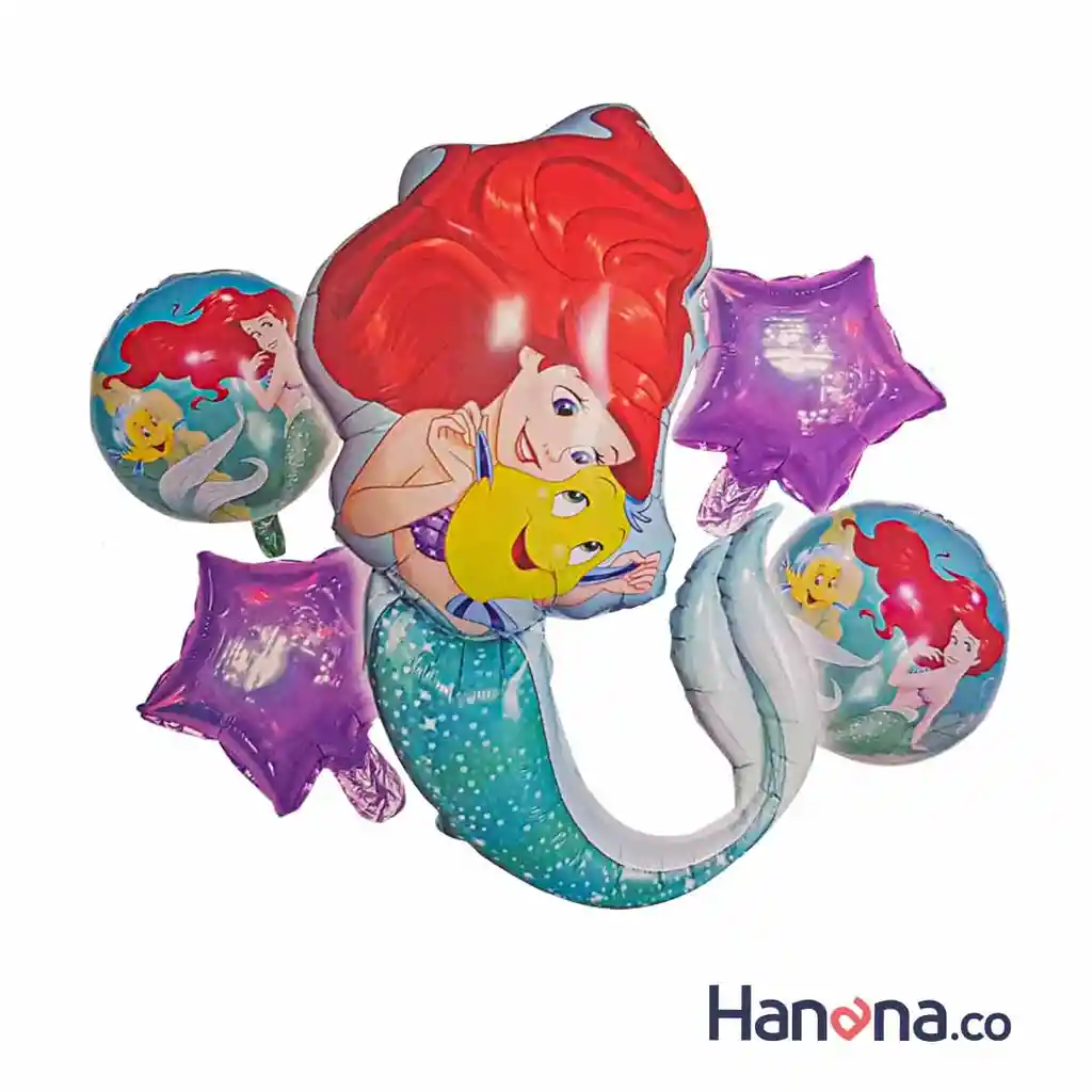 Bouquet de globos modelo sirenita.¿Que incluye?2 globos de estrella morado de 45cm.2 globos redondos estampado la sirenita de 45cm.1 globo modelo la sirenita de 85 cm cm x 68 cm.*Este set se vende sin inflar. puedes usarlo con una base para globos o con helio.