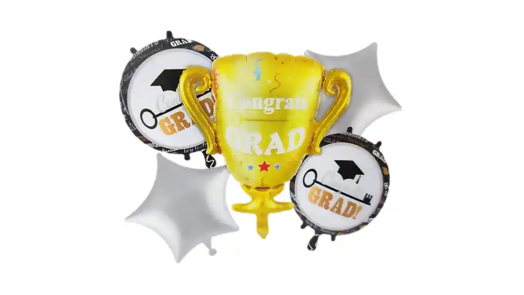 Set Globos Graduación x 5 und 1 Globo Metalizado Trofeo graduacion dorado 72 cm 2 Globos Estrella plateada 18" 2 Globos Redondo Congrats Grad 18" Disponibilidad inmediata nota: Globos sin inflar