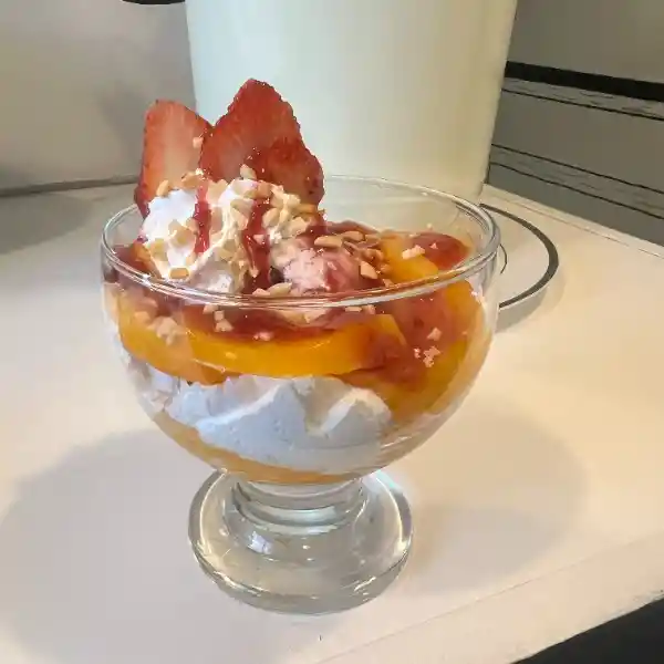 Base de merengue, chantilly, durazno, helado de vainilla, salsa de frutos rojos y fresa