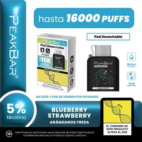 Peak bar 16k POD DESECHABLE sabor ARÁNDANOS FRESA HASTA 16.000 PUFFS NICOTINA 5,0 mg/ml 5%. PRODUCTO EXCLUSIVO PARA MAYORES DE EDAD, ESTE PRODUCTO CONTIENE NICOTINA, LA NICOTINA ES QUIMICO ALTAMENTE ADICTIVO.