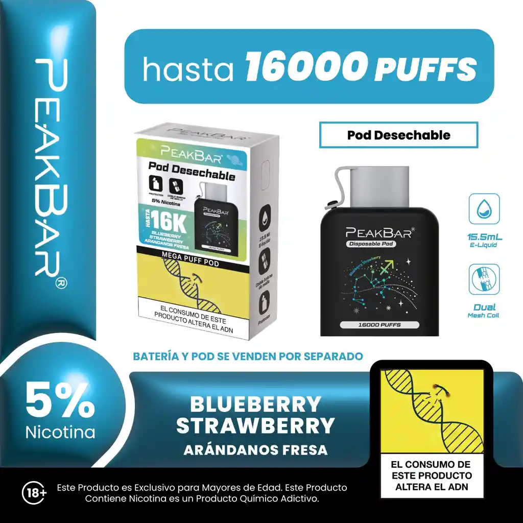 Kit semidesechable con batería reutilizable + pod sabor arándanos fresa. Pensado para larga duración y reposición de pod. Cobertura de garantía por defectos de fábrica según la SIC.
