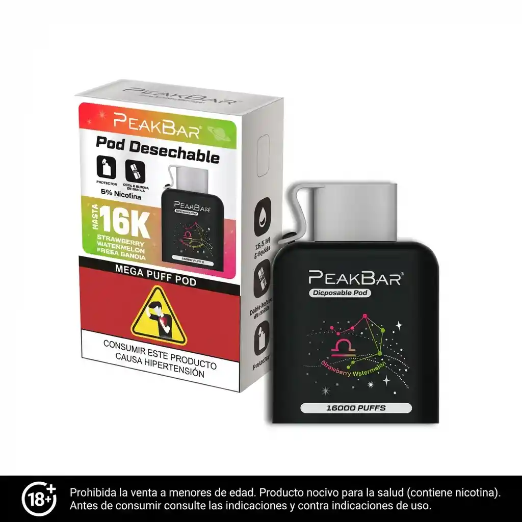 Peak bar 16k POD DESECHABLE sabor SANDÍA FRESA HASTA 16.000 PUFFS NICOTINA 5,0 mg/ml 5%. PRODUCTO EXCLUSIVO PARA MAYORES DE EDAD, ESTE PRODUCTO CONTIENE NICOTINA, LA NICOTINA ES QUIMICO ALTAMENTE ADICTIVO.