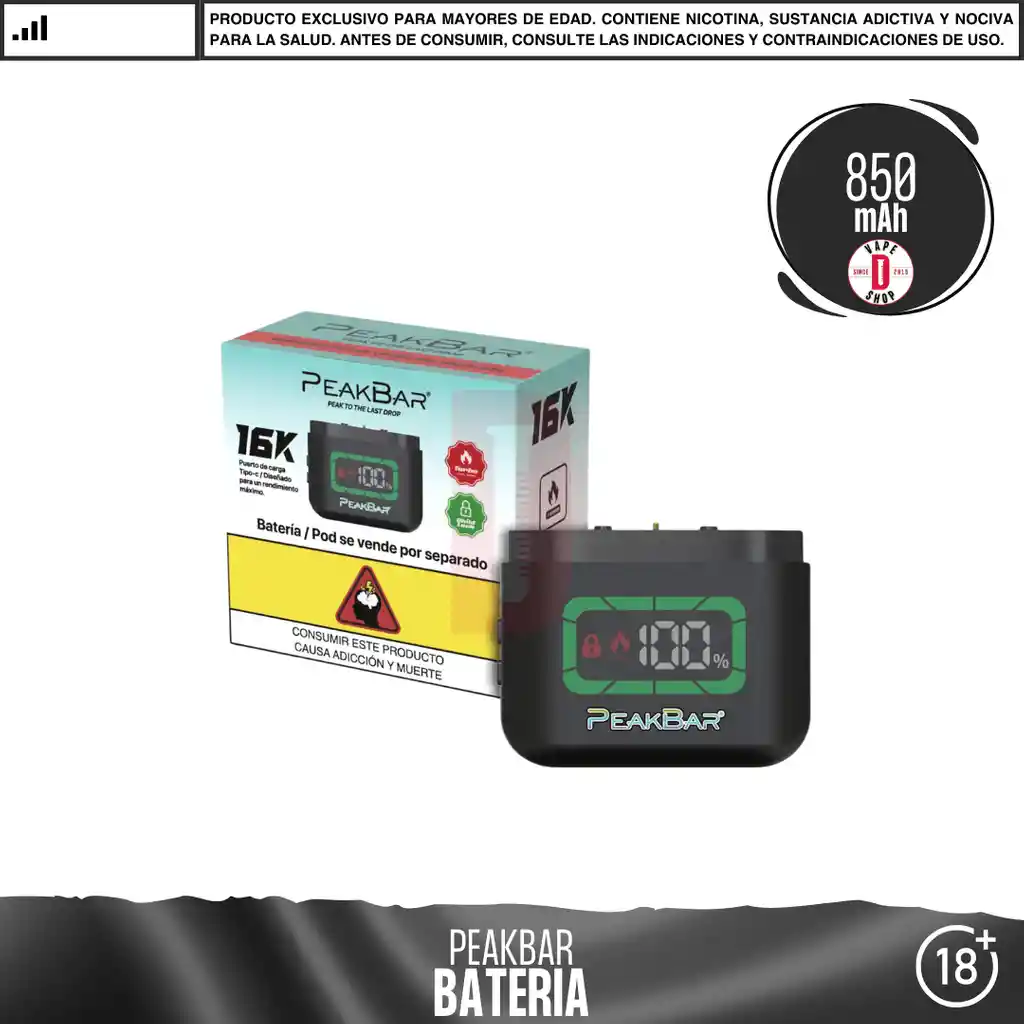 Evapify - PeakBar Batería 850 mAh Descubre el PeakBar 16K, un sistema de vaina desechable de alto rendimiento diseñado para ofrecer un sabor duradero y una experiencia suave. Con hasta 16 000 caladas, tecnología de bobina de malla avanzada y una pantalla digital elegante, PeakBar ofrece un sabor constante y potencia confiable en cada inhalación. Ideal para quienes valoran el estilo, la calidad y la comodidad. Características Principales Batería interna recargable de 850 mAh, lista para durar más tiempo sin necesidad de cargar constantemente. Pantalla integrada, que muestra información esencial como nivel de batería, estado del e-liquid y caladas aproximadas restantes. Diseño compacto, moderno y resistente, ideal para llevar a cualquier parte. Compatible con una amplia gama de sabores: frutales, tropicales, cítricos y mezclas exclusivas de PeakBar. Control total: la pantalla LED mantiene informado al usuario en todo momento. Uso y recomendaciones: El dispositivo llega pre-cargado y pre-rellenado: solo activa y disfruta. Al bajar el nivel de batería, recarga mediante USB-C (según el modelo). Desecha el dispositivo de forma responsable siguiendo las normas de residuos electrónicos de tu zona. Ten en cuenta que la duración total puede variar según el estilo de vapeo del usuario. Ofrece tres dos niveles de potencia: Normal Turbo Características PeakBar - Batería 850 mAh: Sistema pod recargable e intercambiable. Batería recargable de 850 mAh. Diseño compacto y fácil de usar. Incluye: 1 x Batería 850 mAh 1 x Manual de instrucciones Advertencia: Contiene nicotina, que puede ser venenoso. Evitar el contacto con la piel y los ojos. No ingerir. Mantener siempre en empaque original y en un ambiente fresco y seco. Mantener alejado de niños y mascotas. No debe utilizarse por Mujeres en estado de embarazo o personas con problemas de respiración como el asma. En caso de accidente contacte a la línea 123. Producto para mayores de 18 años.