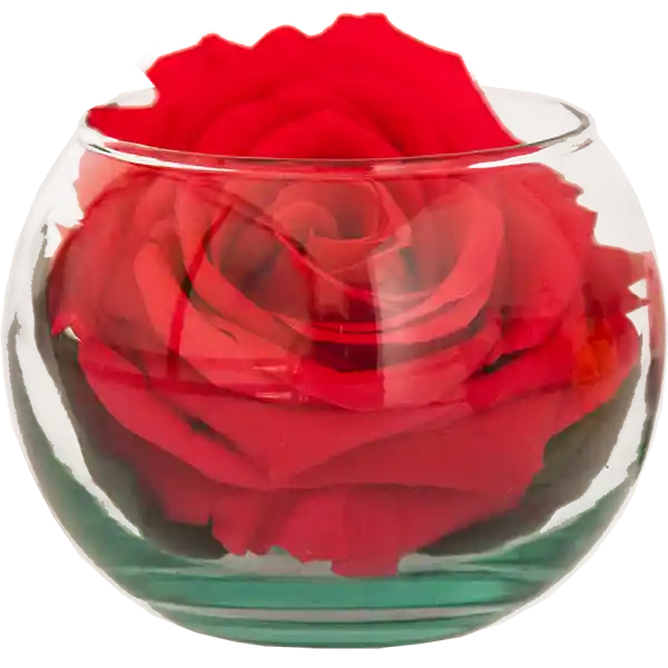 Pecera de vidrio en su interior una cabeza de rosa premium natural preservada, (9cm diámetro) que perdura intacta por meses, sobre hojas de rosa. Color a elección. Tamaño del arreglo 9cm x 8cm. Viene en Bolsa de lujo e Incluye tarjeta.