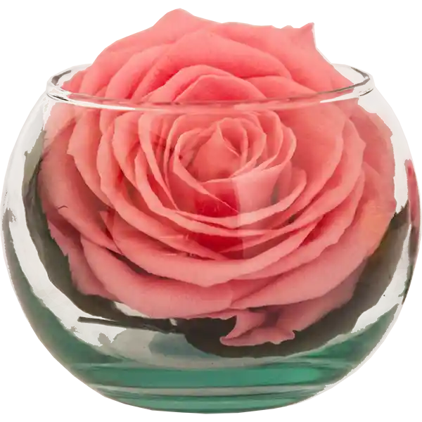 Pecera de vidrio en su interior una cabeza de rosa premium natural preservada, (9cm diámetro) que perdura intacta por meses, sobre hojas de rosa. Color a elección. Tamaño del arreglo 9cm x 8cm. Viene en Bolsa de lujo e Incluye tarjeta.