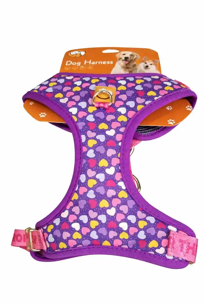 Pechera premium TALLA L con diseño corazones, broches metalicos dorados, perro mediano Diseño: Estampado de corazones púrpuras (Colección "Love" o "Color Blooming"). Características: Ajustable en cuello y pecho, con herrajes de acero y materiales de alta resistencia. Presenta un diseño de corazones multicolores sobre un fondo púrpura y está fabricado con materiales como neopreno y malla transpirable para mayor comodidad de la mascota.