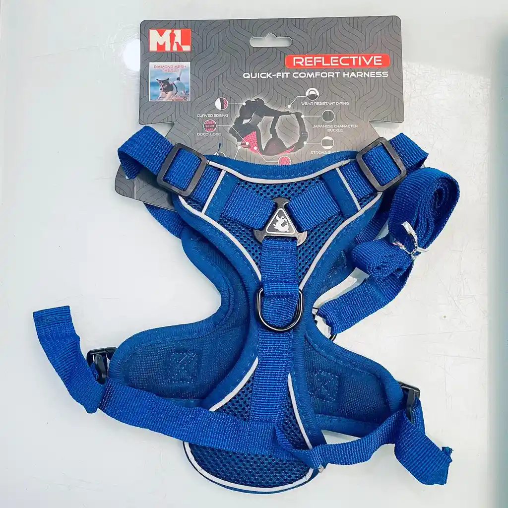 Arnés de ajuste rápido y cómodo ⦁ Ribete reflectivo ⦁ Malla de aire ⦁ Fuerte y duradero ⦁ Ligero ⦁ Fácil de poner y quitar *Incluye lazo* TALLA L Color azul Medidas 47-50cm Peso 7 a 9kg