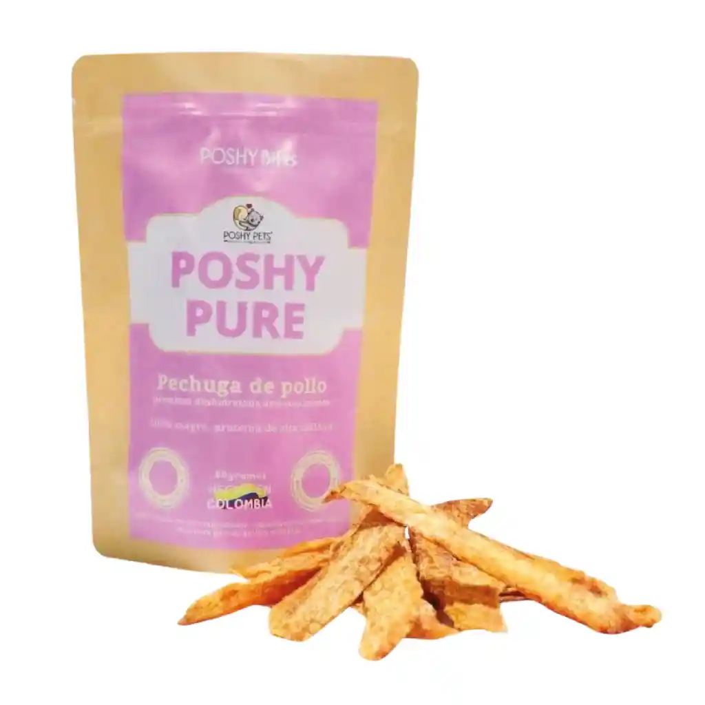 Tu peludito también merece algo natural. Lleva la pureza a su plato. POSHY PURE es 100% pechuga de pollo seleccionada, deshidratada artesanalmente para conservar su sabor y nutrientes. Un snack magro, alto en proteína y bajo en grasa, ideal para entrenamiento o consentir sin culpas. Sin conservantes, sin granos, solo pollo real hecho en Colombia. Ideal para: Mascotas que necesitan cuidar su peso o con estómagos sensibles. Origen: Fabricación Local Colombiana Ingredientes: 100% Pechuga de pollo Presentación: Doypack con cierre hermético para máxima frescura. Uso: Complemento alimenticio / Premio. Registro ICA: 01387002025
