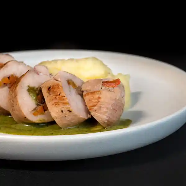 ROLLO DE FILETE DE PECHUGA DE POLLO, RELLENO CON VEGETALES, TOCINETA Y ARANDANOS, ACOMPANADO DE SALSA CREMOSA DE ALBAHACA. SE ENTREGA CONGELADO, EMPACADO AL VACIO EN PORCION PERSONAL, PARA CALENTAR EN AGUA HIRVIENDO POR POCOS MINUTOS, SERVIR Y DISFRUTAR.