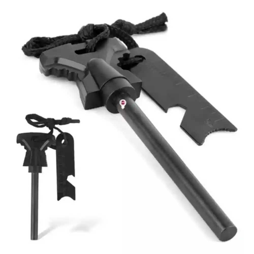 El pedernal de supervivencia con rascador metálico es una herramienta esencial para actividades al aire libre, diseñada para generar chispas de alta temperatura de forma rápida y confiable. Gracias a su barra de magnesio de alta calidad, permite encender fuego incluso en condiciones climáticas adversas como lluvia, viento o humedad, lo que lo convierte en un accesorio indispensable para campistas, excursionistas y aventureros. Su diseño compacto, ligero y resistente facilita llevarlo en mochilas, kits de supervivencia o equipos de emergencia. Incluye una rasqueta de acero multifuncional con regla y abrebotellas, que permite generar chispas fácilmente al raspar la barra de magnesio. El sistema produce chispas intensas capaces de encender yesca, papel, hojas secas o material inflamable en cuestión de segundos. Este pedernal está diseñado para ofrecer más de 100 encendidos, garantizando durabilidad y fiabilidad en cualquier situación. Además, incorpora un cordón de sujeción que permite mantener las piezas juntas y transportarlo de forma segura. Ideal para camping, senderismo, bushcraft, pesca, caza, supervivencia y uso táctico, siendo una herramienta práctica para cualquier amante de la aventura o para incluir en un kit de emergencia. Especificaciones Material: Barra de pedernal (magnesio) y rascador de acero Dimensiones del producto: 110 x 43 x 8 mm Longitud de la rasqueta metálica: 75 mm Peso: 49 g Encendidos: Más de 100 usos Incluye: Barra de pedernal, rascador metálico multifuncional y cordón de sujeción