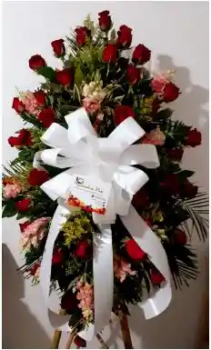 Arreglo floral con rosas, follajes, moño y tarjeta de condolencias,elaborado sobre una base pedestal. Colores surtidos a elegir según disponibilidad. de color Multicolor ideal para el Felicitaciones