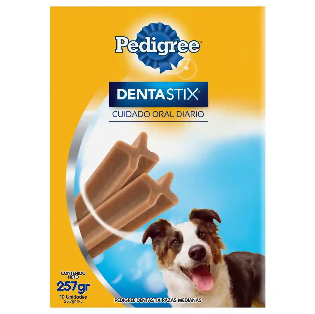 Pedigree Dentastix es el snack perfecto para mantener a tu perro feliz y activo. Cada caja contiene 10 barras de 25.7 gramos, ideales para perros adultos de razas medianas y grandes. Estas barras son una excelente forma de recompensar a tu mascota por su buen comportamiento y reforzar su higiene bucal. Ingredientes Almidón de trigo, harina de trigo, harina de maíz, glicerol, agua, goma arábiga, minerales (carbonato de calcio, cloruro de potasio, sorbato de potasio, sulfato de zinc), torta de soya, tripolifosfato de sodio, celulosa, harina de subproductos y/o menudencias de pollo, gelatina porcina y/o bovina, digesto animal (pollo y/o cerdo y/o bovino), hidrolizado de origen vegetal (soya y/o melaza), colorante caramelo, sabor artificial a pollo, emulsionante (esteres mono y digliceridos de ácido diacetil tartárico). Información del producto: Suplemento alimenticio destinado al cuidado oral de los perros adultos de razas medianas y grandes. Este producto ayuda a eliminar el sarro y controlar la placa bacteriana. Se recomienda 1 barra diaria.