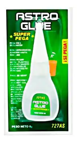 La Astro Glue es un pegamento adhesivo instantáneo compuesto por cianocrilato capaz de unir una gran cantidad de superficies. Este producto tiene un excelente nivel de calidad garantizando la adherencia deseada. Pega sobre metal, plástico, vidrio, madera, porcelana, papel, cuero y mucho más. Pegado instantáneo.