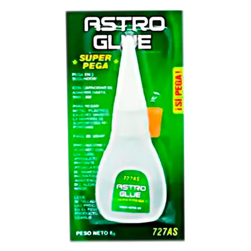 SUPER ASTRO GLUE, Es un Adhesivo instantáneo de avanzada tecnología, resistente al agua, seca transparente. Hecho en Colombia, de Alta Composición. ¡Aprovecha!: * 8 Gramos * Para pegar en segundos gran cantidad de materiales. * Apto Para superficies difíciles de alcanzar * Contiene 12Und. * Artículo Nuevo, En Empaque. * Color, Transparente. * Somos Distribuidores de la Marca. * Entregas el Mismo Dia. (Bogotá)" Recomendaciones: Después de su uso tape inmediatamente el envase y guarde en un lugar seco y fresco, siempre con la punta hacia arriba. USO: Preparación de la superficie. * Limpiar y secar perfectamente antes de aplicar.