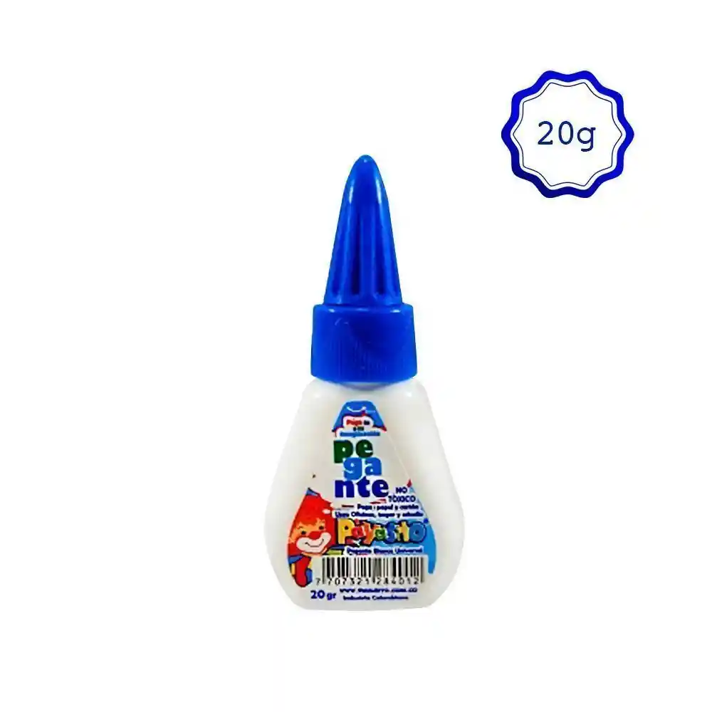Contenido: 20 gr. Color del pegamento: Blanco. Pegante líquido blanco, marca Payasito, de uso escolar, no emite olores fuertes, lavable. Este pegamento contiene un alto poder de adherencia, no mancha. Envase ergonómico de fácil sujeción. Tapa dosificadora, la aplicación del producto será más uniforme y limpia. Especialmente para aplicar en papel y en manualidades.