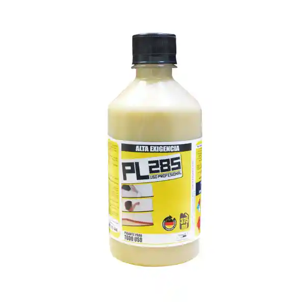 Pegante para madera, Cont. neto 750mEl cemento PL-285 PROFESIONAL posee un alto contenido de sólidos, lo que proporciona alto rendimiento y fuerza de pegue. Adicionalmente, su agarre inicial permite fijar fácilmente los materiales a pegar. Su viscosidad le proporciona un buen cubrimiento de las superficies permitiéndole aplicar el adhesivo fácilmente. Por su tiempo abierto, el producto conserva su pegajosidad, lo cual es favorable en ensambles de gran tamaño. Su alta resistencia a la temperatura le proporciona a la unión resistencia a temperaturas ambientales elevadas.