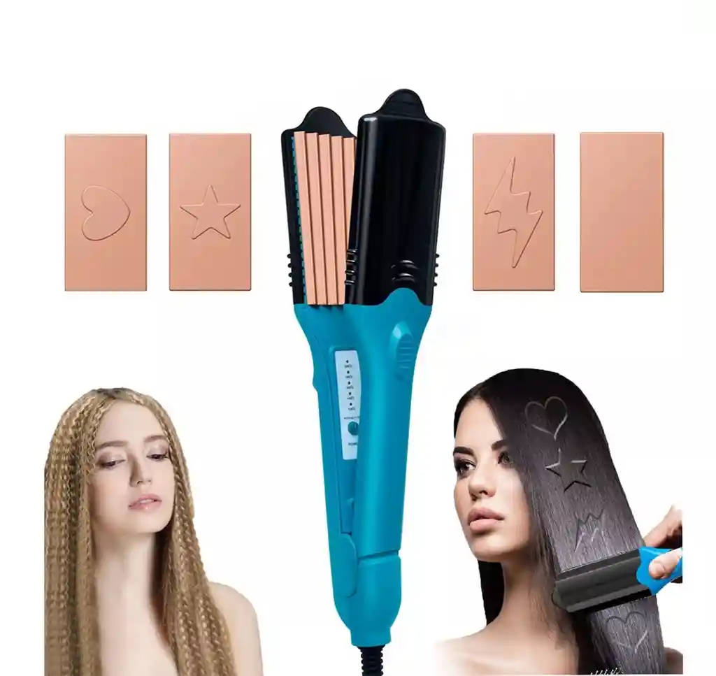 La plancha para el cabello 3D 5 en 1 es una herramienta versátil y creativa que te permite alisar, rizar y estampar divertidas figuras en tu cabello con sus placas intercambiables en forma de corazones, estrellas y relámpagos. Con calentamiento rápido en 15 segundos y ajuste de temperatura de 120°C a 200°C, se adapta a diferentes tipos de cabello para lograr un peinado duradero. Su diseño compacto y ligero, junto con su cable giratorio de 6.6 pies, la hacen ideal para viajar. Fabricada en material ABS y con un uso intuitivo de solo tres botones, es perfecta para quienes buscan un estilo único y moderno. Ficha Técnica: Dimensiones: 30 cm x 4 cm Material: ABS - Ceramica Potencia: 10 W Voltaje: 110 V / 220 V 50-60 Hz ** _Para defectos de fábrica o retractos: \**_Por favor revise el producto apenas lo reciba y antes de usarlo. No aplican ley de retracto o defectos de fábrica luego de usar el producto. Se manejan máximo 5 días para reportar defectos de fábrica (por ejemplo, producto funciona mal, piezas faltantes, rotas, etc). Para hacer efectiva la devolución el producto debe devolverse con el empaque original, el cual debe estar en buen estado, incluir todos los documentos y las partes completas y sin daños.