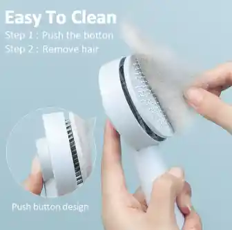 Esos peines se llaman comúnmente deslanadores, cepillos tipo Furminator o cardas autolimpiantes. Utilizan dientes finos de acero inoxidable para eliminar el subpelo y el pelo muerto, y cuentan con un botón eyector que empuja el pelo acumulado fuera de las púas para una limpieza fácil y rápida