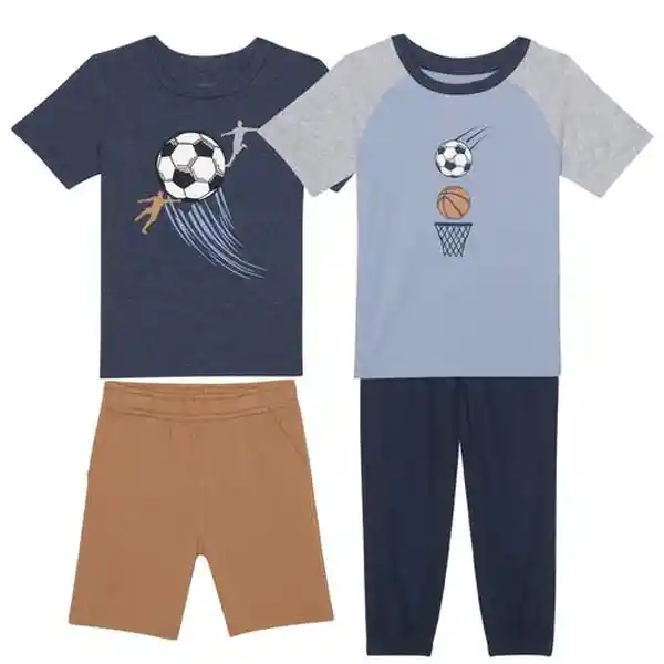 Contiene 4 Unidades. Completa el Look de tu Pequeño Con el Conjunto Para Niño de Pekkle ¡Con 2 Camisetas y 2 Opciones de Pantalones Pantalonetas o Mixto Podrás Crear Múltiples Combinaciones! Elige Entre Los Motivos Deportivos de Dinosaurios o de Astronauta Para un Estilo Único y Divertido. Hecho Con Materiales de Alta Calidad Para Garantizar Comodidad y Durabilidad.