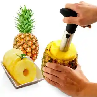 PELADOR CORTADOR DE PIÑA Material del mango: Plástico Material del cuerpo: Aluminio Largo: 10 cm Descripción El mejor rebanador y cortador de piña en espiral. 100% seguro y durable. Mango removible para sacar fácilmente las rodajas. Saca perfectamente la pulpa de la piña y separa el tronco. Fácil de limpiar. En acero inoxidable de la mejor calidad. Con mango ergonómico para un mejor agarre. Para uso en casa o negocio. De fácil uso. En instantes la piña estará cortada y lista para servir. La piña sin la pulpa la puedes ocupar para servir un coctel, nieve o como adorno