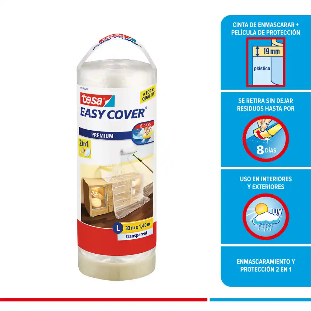 Bienvenid@ a la Tienda Oficial tesa Colombia - El cubre fácil premium tesa easy cover®, es un cobertor de alta calidad que protege los acabados de los pintores. - su plástico protector cubre grandes áreas y lleva integrada cinta de enmascarar tesa® para una fácil aplicación. - El cubre fácil premium tesa easy cover®, no solo permite cubrir fácilmente los bordes, también es ideal para proteger el suelo y los muebles valiosos de salpicaduras de pinturas accidentales. - Utilízalo como una lona de plástico o como película protectora de pintura para cubrir las superficies grandes de manera fácil y rápida siempre que emprendas un proyecto de pintura y renovación. - color: transparente - medidas: 1400mmx33mm