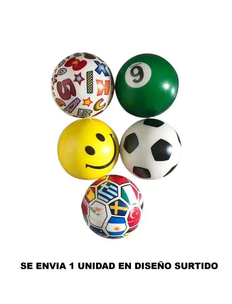 Se adapta perfectamente a la mano de cualquier persona sin importar su edad Uso: juego infantil recreativo o antiestrés y rehabilitación para adultos Los objetos en la imagen son pelotas antiestrés (stress balls). Son pequeños objetos blandos diseñados para ser apretados con la mano, con el objetivo principal de aliviar la tensión y el estrés. Materiales comunes: Generalmente están hechas de espuma de poliuretano, caucho (natural o termoplástico) o gel. Variedad de formas: Aunque se llaman "pelotas", vienen en muchas formas y diseños, como los que se ven en la imagen (cara sonriente, balón de fútbol, bola de billar con el número 9, etc.). Beneficios: Ayudan a reducir la ansiedad, mejorar la concentración y fortalecer los músculos de la mano y los dedos. Uso médico: También se utilizan en entornos médicos para ejercicios de manos o para ayudar durante las extracciones de sangre